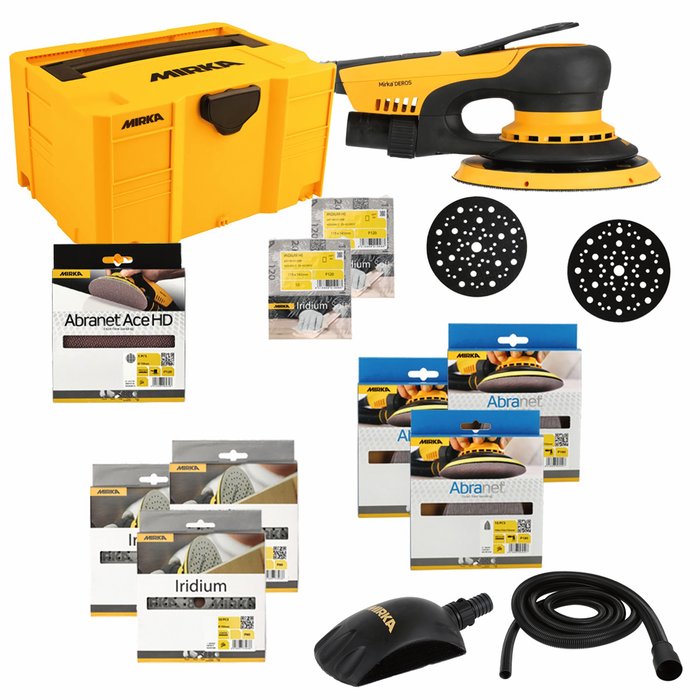 Mirka DEROS II 650 Ø150mm 5,0mm Hub Set bestehend aus: Abranet Grip Ø150mm P120, P180, P240 (je 10Stk.) | Iridium 121L Ø150mm P80, P120, P180 (je 10Stk.) | Abranet Ace HD Ø150mm P40 (5Stk.) | 1x Schutzauflage Ø150mm 67L 1 x Softauflage Ø150mm 67L Iridium HS Soft 115x140mm P120, P240 (je 10Stk.) | 1 x Roundy Handblock mit Absaugung | 1 x Absaugschlauch 4m 20–32mm für Handblock | 1 x Mirka Case gelb