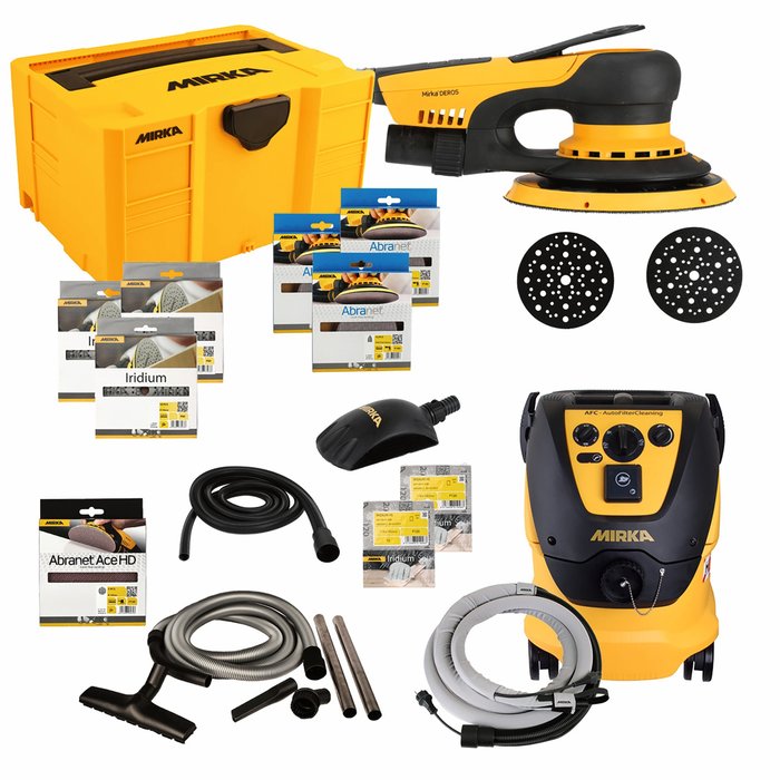 Mirka DEROS II 650 Ø150mm 5,0mm Hub + M AFC Set bestehend aus: Abranet Grip Ø150mm P120, P180, P240 (je 10Stk.) | Iridium 121L Ø150mm P80, P120, P180 (je 10Stk.) | Abranet Ace HD Ø150mm P40 (5Stk.) | 1x Schutzauflage Ø150mm 67L 1 x Softauflage Ø150mm 67L | Iridium HS Soft 115x140mm P120, P240 (je 10Stk.) | 1 x Roundy Handblock mit Absaugung | 1 x Absaugschlauch 4m 20–32mm für Handblock | 1 x Mirka Case gelb | 1x Fleecebeutel | 1 x Industrie-Staubsauger 1230 M AFC EU 230 V inkl. Mirka Manschette KIT (Kabel CE 230V + Schlauch 4m) und Reinigungsset für Mirka Industrie